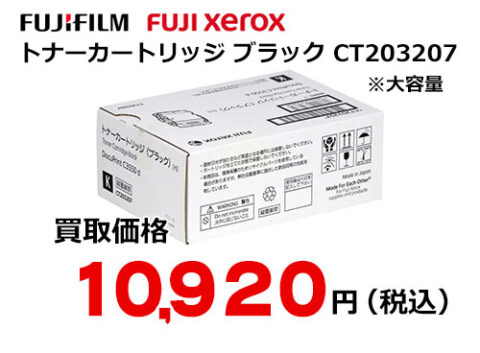 富士フイルム(XEROX) トナーカートリッジ(ブラック) CT203207 ただいま高価買取中! ※表示の価格は、2026年4月15日 現在のものです。 ※買取価格は、商品の状態や市場動向によって変わる場合があります。 ※パッケージは変更になっている場合がございます。 最新の買取価格は、下記「無料見積もり依頼」よりお問い合わせ下さい。 富士フイルム(旧ゼロックス FUJI XEROX)純正 大容量トナーカートリッジ ブラック CT203207 カラー:ブラック 印刷枚数:15000 枚(大容量タイプ) 対応機種:DocuPrint C3550 d