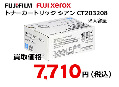 富士フイルム(XEROX)トナーカートリッジ(シアン) CT203208 ただいま高価買取中! ※表示の価格は、2026年4月15日 現在のものです。 ※買取価格は、商品の状態や市場動向によって変わる場合があります。 ※パッケージは変更になっている場合がございます。 最新の買取価格は、下記「無料見積もり依頼」よりお問い合わせ下さい。 富士フイルム(旧ゼロックス FUJI XEROX)純正 大容量トナーカートリッジ シアン CT203208 カラー:シアン 印刷枚数:10000 枚(大容量タイプ) 対応機種:DocuPrint C3550 d