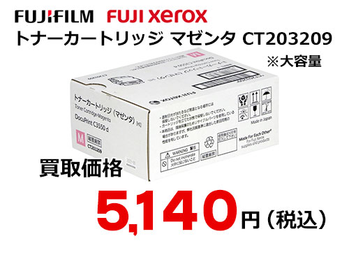富士フイルム(XEROX)トナーカートリッジ(マゼンタ) CT203209 ただいま高価買取中! ※表示の価格は、2026年4月15日 現在のものです。 ※買取価格は、商品の状態や市場動向によって変わる場合があります。 ※パッケージは変更になっている場合がございます。 最新の買取価格は、下記「無料見積もり依頼」よりお問い合わせ下さい。 富士フイルム(旧ゼロックス FUJI XEROX)純正 大容量トナーカートリッジ マゼンタ CT203209 カラー:マゼンタ 印刷枚数:10000 枚(大容量タイプ) 対応機種:DocuPrint C3550 d
