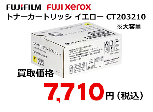 富士フイルム(XEROX)トナーカートリッジ(イエロー) CT203210 ただいま高価買取中! ※表示の価格は、2026年4月15日 現在のものです。 ※買取価格は、商品の状態や市場動向によって変わる場合があります。 ※パッケージは変更になっている場合がございます。 最新の買取価格は、下記「無料見積もり依頼」よりお問い合わせ下さい。 富士フイルム(旧ゼロックス FUJI XEROX)純正 大容量トナーカートリッジ イエロー CT203210 カラー:イエロー 印刷枚数:10000 枚(大容量タイプ) 対応機種:DocuPrint C3550 d