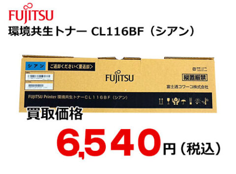 富士通 環境共生トナー CL116BF(シアン) ただいま高価買取中! ※表示の価格は、2025年11月17日 現在のものです。 ※買取価格は、商品の状態や市場動向によって変わる場合があります。 ※パッケージは変更になっている場合がございます。 最新の買取価格は、下記「無料見積もり依頼」よりお問い合わせ下さい。 富士通(FUJITSU) 純正 トナーカートリッジ(環境共生トナー) CL116BF シアン(商品番号:0890244) カラー:シアン 印刷枚数:10000枚(大容量) 対応機種:FUJITSU Printer XL-C8350