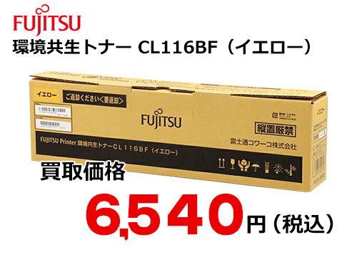 富士通 環境共生トナー CL116BF(イエロー) ただいま高価買取中! ※表示の価格は、2025年11月17日 現在のものです。 ※買取価格は、商品の状態や市場動向によって変わる場合があります。 ※パッケージは変更になっている場合がございます。 最新の買取価格は、下記「無料見積もり依頼」よりお問い合わせ下さい。 富士通(FUJITSU) 純正 トナーカートリッジ(環境共生トナー) CL116BF イエロー(商品番号:0890224) カラー:イエロー 印刷枚数:10000枚(大容量) 対応機種:FUJITSU Printer XL-C8350