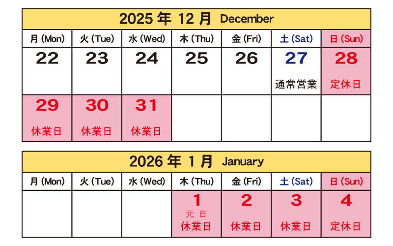 年末年始休業日:2025年12月28日(日)~ 2026年1月4日(日)※定休日を含む